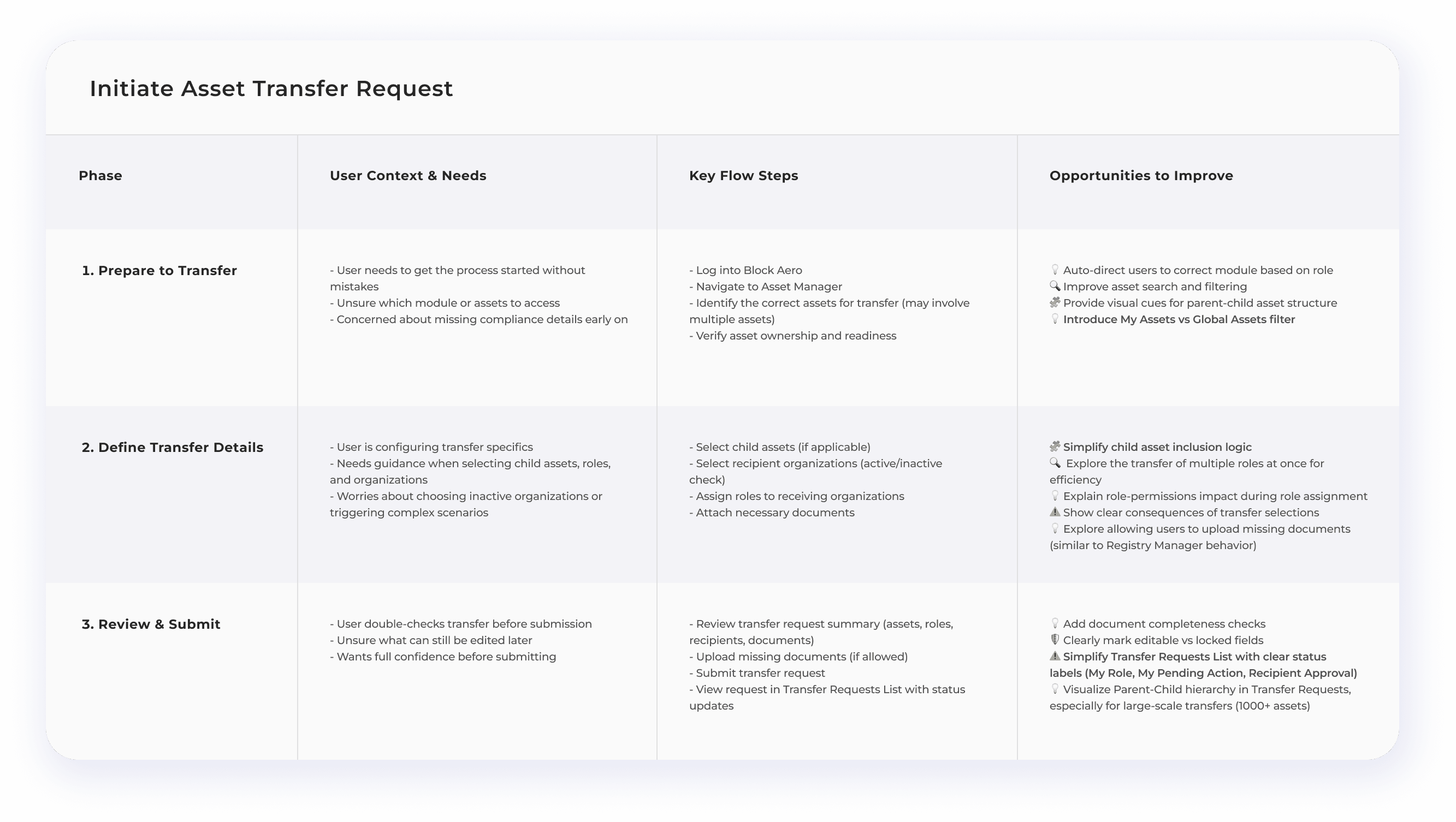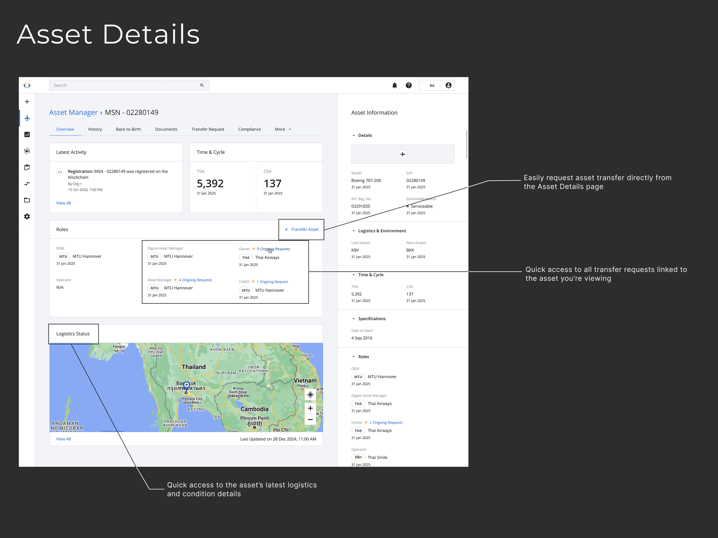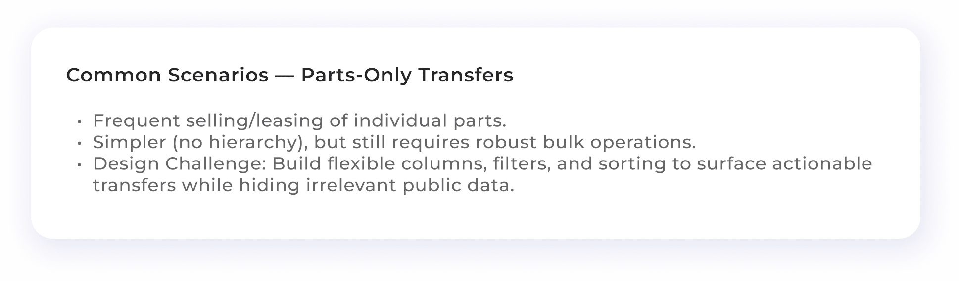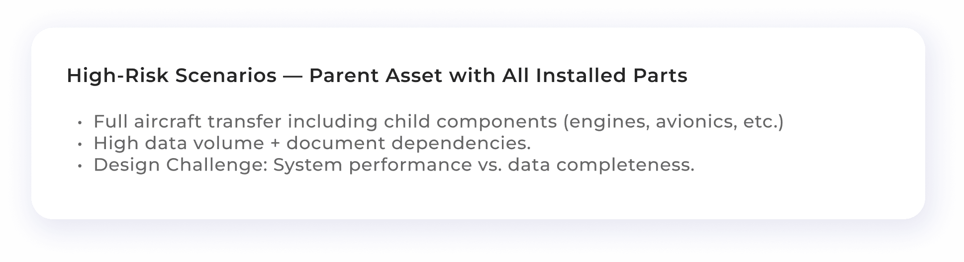 Example: If the main asset (Aircraft) is transferred, how do we handle the transfer of installed parts? Should they be included in the request, or handled separately? We worked closely with engineers and data architects to define a consistent, reliable approach.