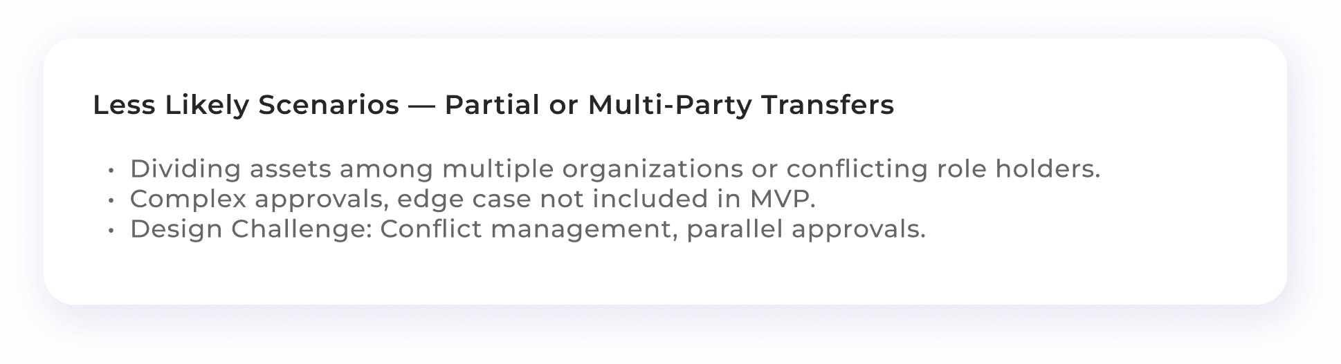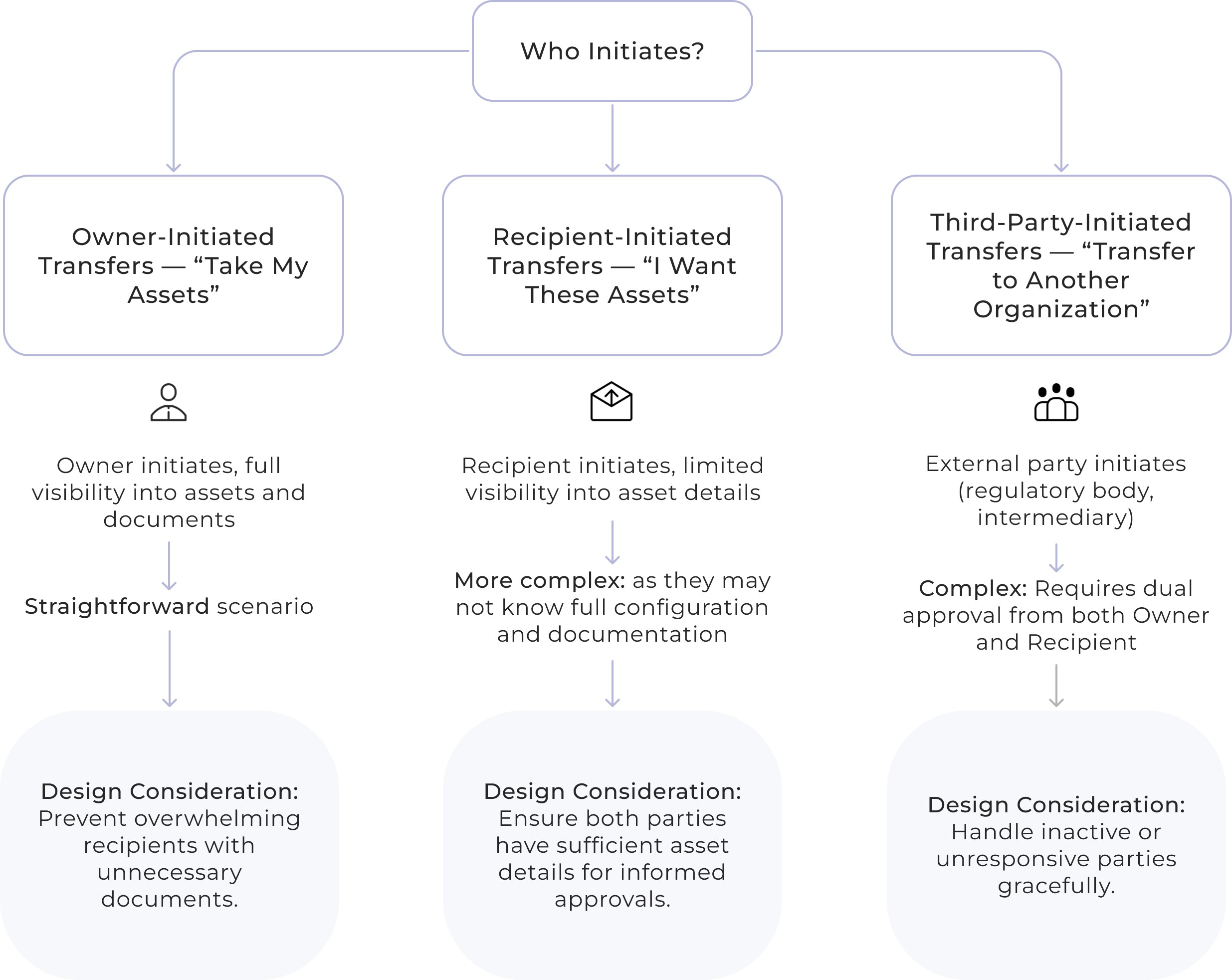 Designing the Asset Transfer MVP meant finding the right balance between complexity and scalability. We mapped out key flows without overengineering edge cases, leaving space for future improvements based on real user feedback. I started by asking a simple question: Who is initiating the transfer, and why?