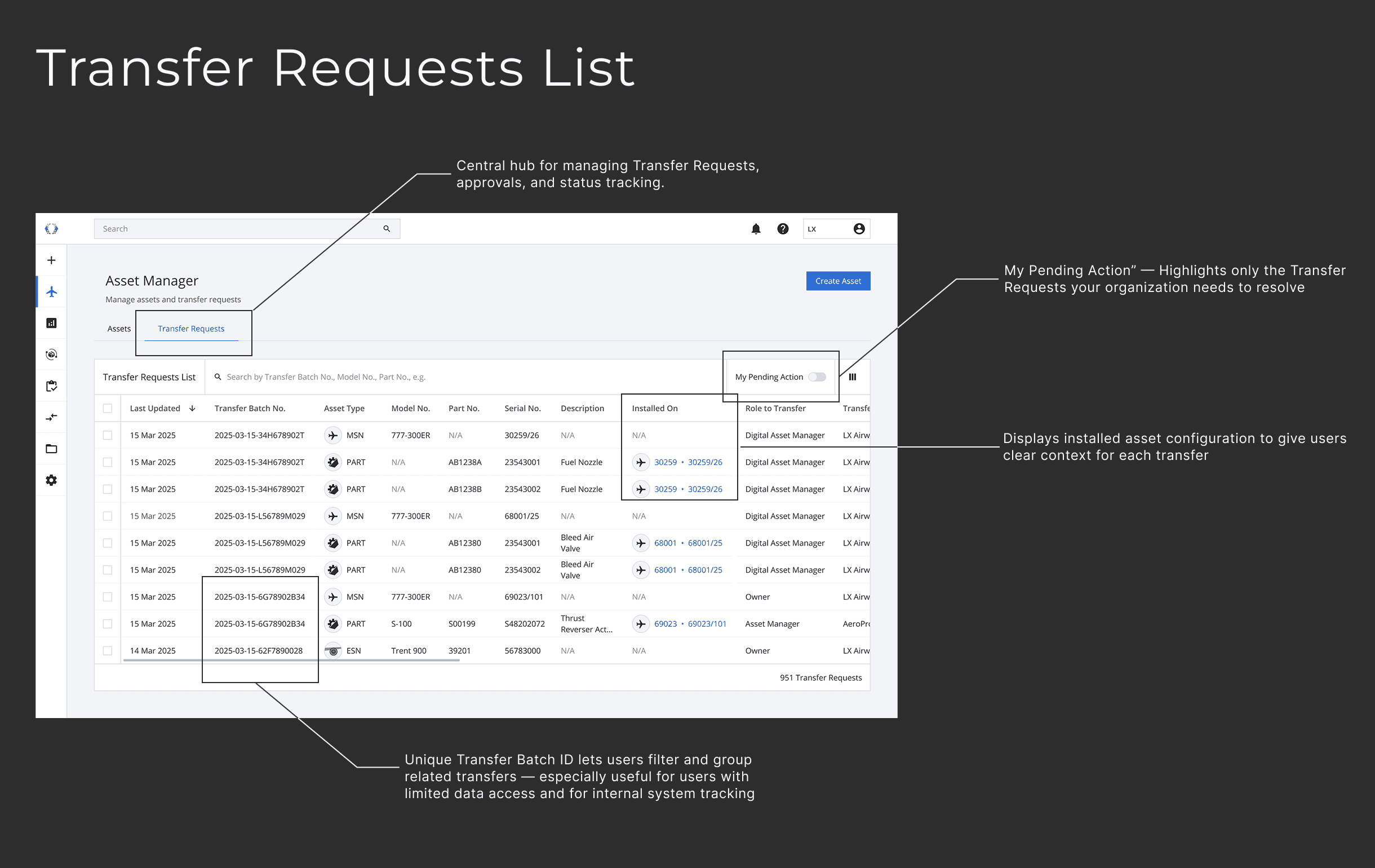 Installed asset configuration provides context for parts-only transfers, while unique Transfer Batch IDs group related transfers — essential for high-risk, bulk operations.